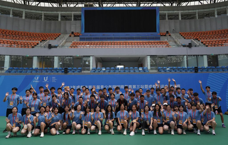 參與服務(wù)成都大運(yùn)會網(wǎng)球賽事的志愿者在此前的測試賽中合影留念