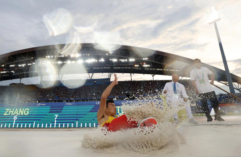 8月6日,張景強(左)在比賽中。當(dāng)日,在成都大運會男子跳遠決賽中,他以7米93的成績獲得金牌。新華社記者 賈浩成 攝