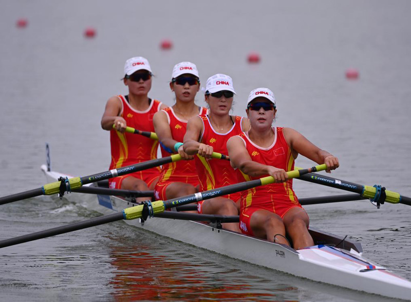 男子四人單槳和女子四人單槳是中國隊(duì)強(qiáng)項(xiàng)。由宋春曉、宗照山、劉江宇和肖揚(yáng)組成的中國隊(duì)在男子四人單槳決賽中,以四個(gè)計(jì)時(shí)點(diǎn)排名第一、最終用時(shí)6分09秒46奪金。女子四人單槳決賽中,張書賢、劉曉鑫、王子鳳和徐星葉各自體能、技術(shù)實(shí)力過硬,每一槳的動(dòng)作都極其整齊、宛如一人,她們最終以6分41秒05的成績,為中國隊(duì)再添一金。