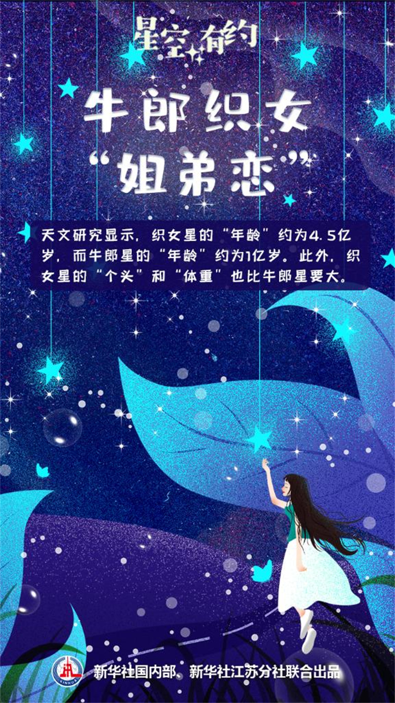 天文研究顯示,牛郎星與織女星不僅是“異地戀”,還是“姐弟戀”。王科超介紹,織女星的“年齡”約為4.5億歲,而牛郎星的“年齡”約為1億歲??椗堑摹皞€頭”和“體重”也比牛郎星要大??椗堑馁|(zhì)量約為太陽的2.1倍,赤道直徑約為太陽的2.8倍;牛郎星的質(zhì)量約為太陽的1.7倍,赤道直徑約為太陽的1.8倍。因為自轉(zhuǎn)速度極快,織女星和牛郎星都把自己“甩”成了橢球狀。