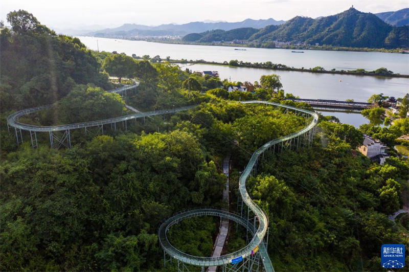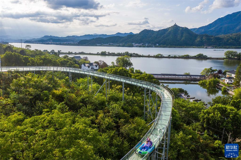 8月19日,游客在三都漁村體驗(yàn)星空水滑道特色項(xiàng)目(無(wú)人機(jī)照片)。