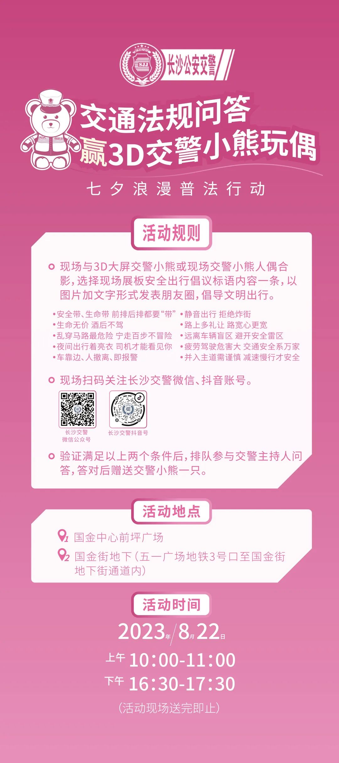 “七夕”當(dāng)天(上午10:00-11:00、下午16:30-17:30),分別在國金中心前坪和國金街地下通道大屏前設(shè)置兩個(gè)普法互動(dòng)打卡點(diǎn),開展普法宣教互動(dòng)贈(zèng)送長沙交警小熊玩偶活動(dòng)?,F(xiàn)場(chǎng)民警將開展普法宣傳,邀請(qǐng)市民參與“交通法規(guī)問答贏交警小熊玩偶”活動(dòng), 通過答題和游戲互動(dòng)可獲得“交警小熊”玩偶一只。(注意,是必得哦)