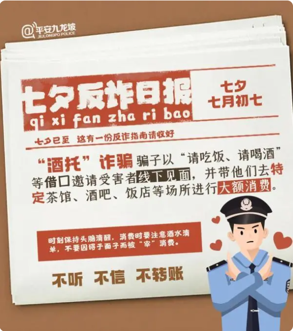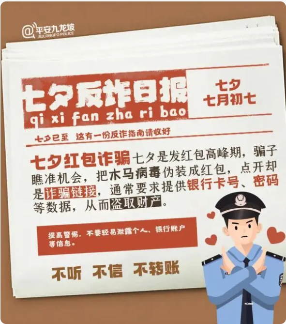 針對各類以“七夕”為幌子的詐騙手段,重慶市公安局九龍坡區(qū)分局也精心制作了一份反詐日報,提醒廣大群眾注意防范各類電信詐騙,勿將“七夕節(jié)”變成“七夕劫”。
