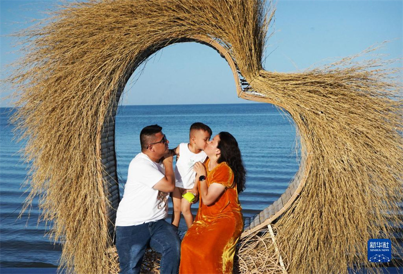 8月31日,游客在新疆博斯騰湖大河口景區(qū)拍照。