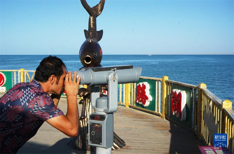 8月31日,在新疆博斯騰湖大河口景區(qū),游客使用望遠(yuǎn)鏡觀察遠(yuǎn)方。