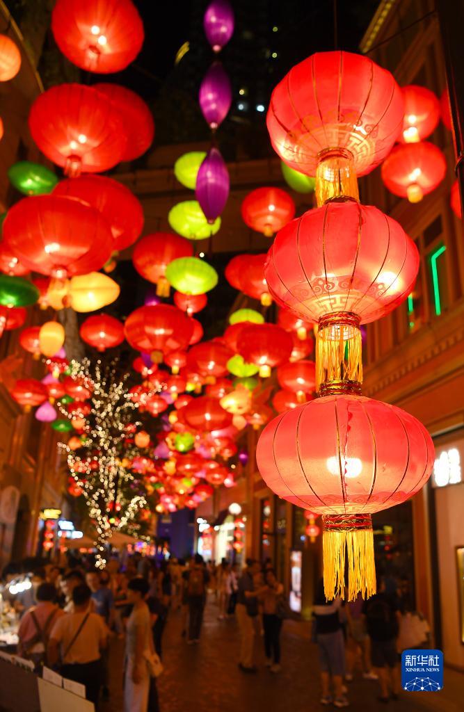 為迎接中秋佳節(jié)的到來,香港利東街舉辦“躍兔·迎月”戶外彩燈會(huì)。約200米長的林蔭大道懸掛起800多個(gè)五彩繽紛的中式燈籠,營造出喜慶的佳節(jié)氣氛。