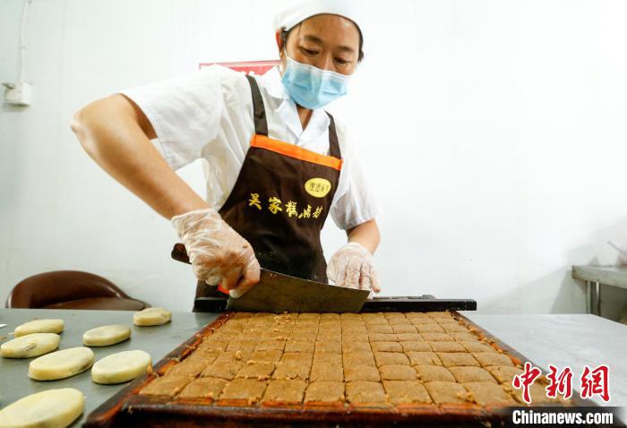 9月19日,臨近中秋,在安徽省黃山市徽州區(qū)潛口鎮(zhèn)澄塘村,傳統(tǒng)火腿月餅進入產(chǎn)銷旺季。制餅手藝人經(jīng)過和油面、扯面團、包油酥、包餡料、烤制等純手工工序,制成皮酥餡飽的火腿“土月餅”,深受食客的喜愛。
