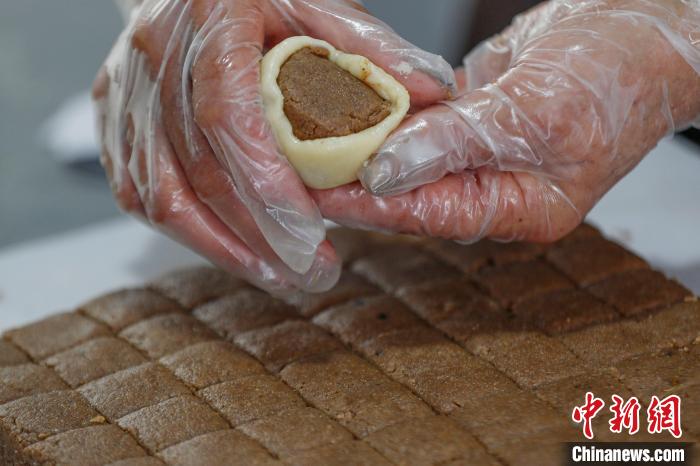 9月19日,在安徽省黃山市徽州區(qū)澄塘村,制餅手藝人正在包餡。施亞磊 攝