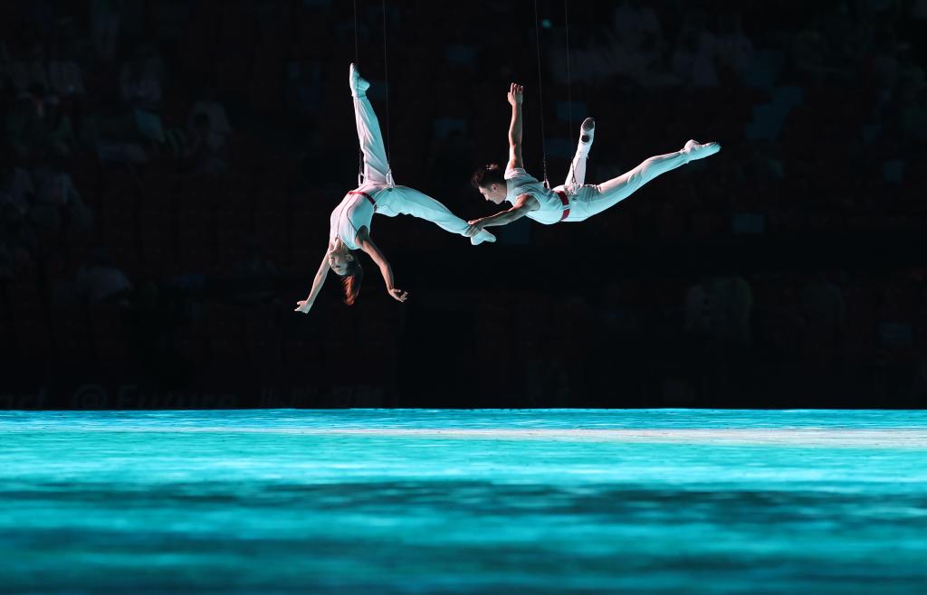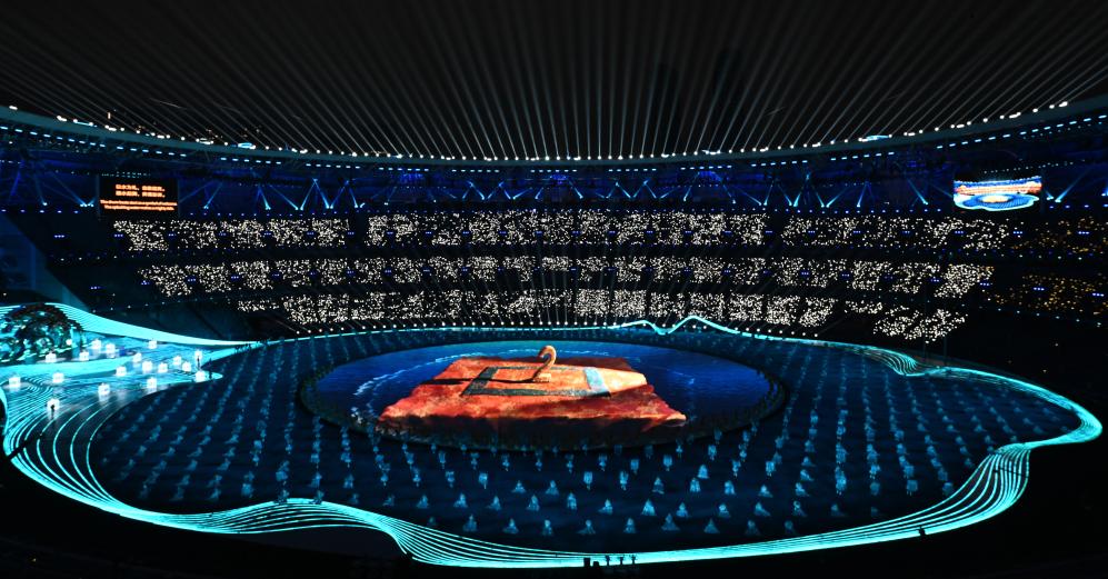 開幕式實(shí)現(xiàn)了兩個首創(chuàng):3D雙威亞首次應(yīng)用于大型運(yùn)動場,首次采用“數(shù)實(shí)融合”的點(diǎn)火方式。