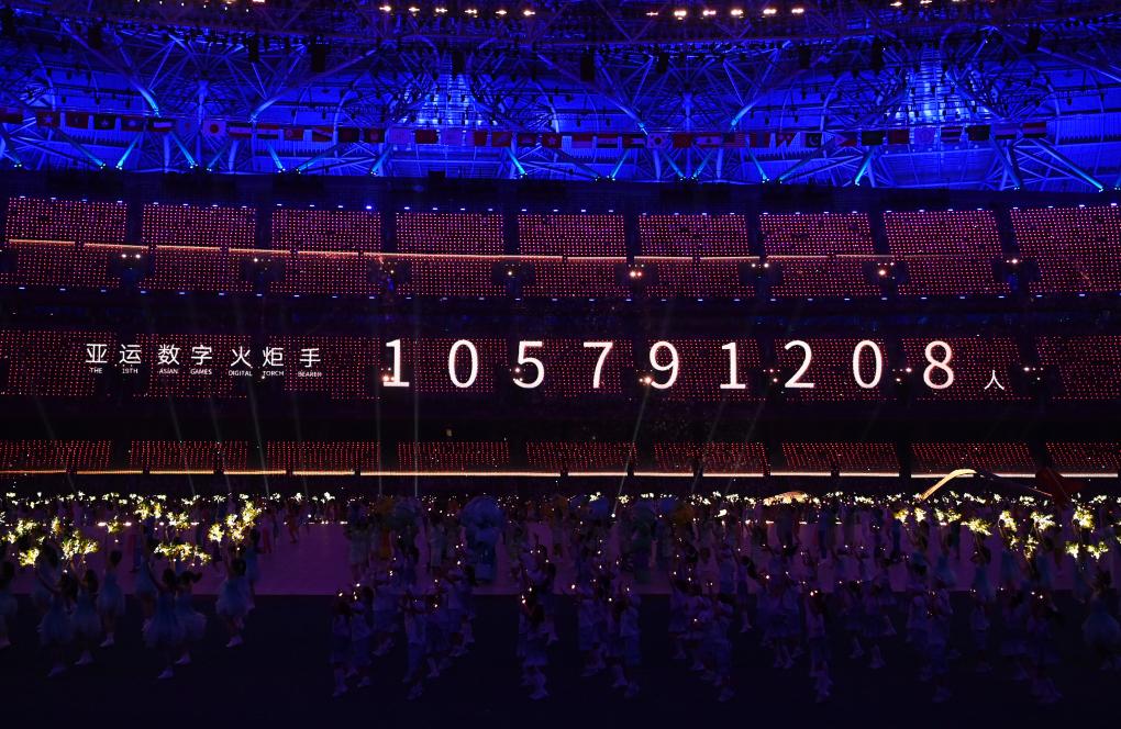 這是9月23日拍攝的開幕式現(xiàn)場顯示的亞運(yùn)數(shù)字火炬手人數(shù)。新華社記者 黃宗治 攝