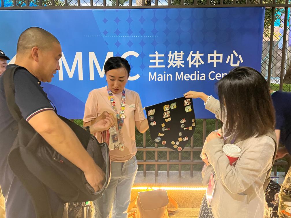 9月24日,在杭州國(guó)際博覽中心的主媒體中心,一位徽章愛好者與記者交換徽章。新華社記者 張璇 攝