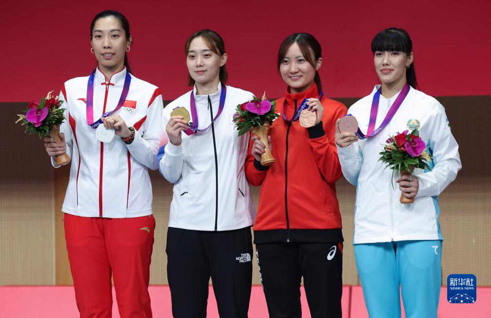 9月26日,冠軍韓國選手尹智秀(左二)、亞軍中國選手邵雅琦(左一)、季軍日本選手尾崎世梨(右二)、烏茲別克斯坦選手扎伊娜卜·達伊別科娃在頒獎儀式上。