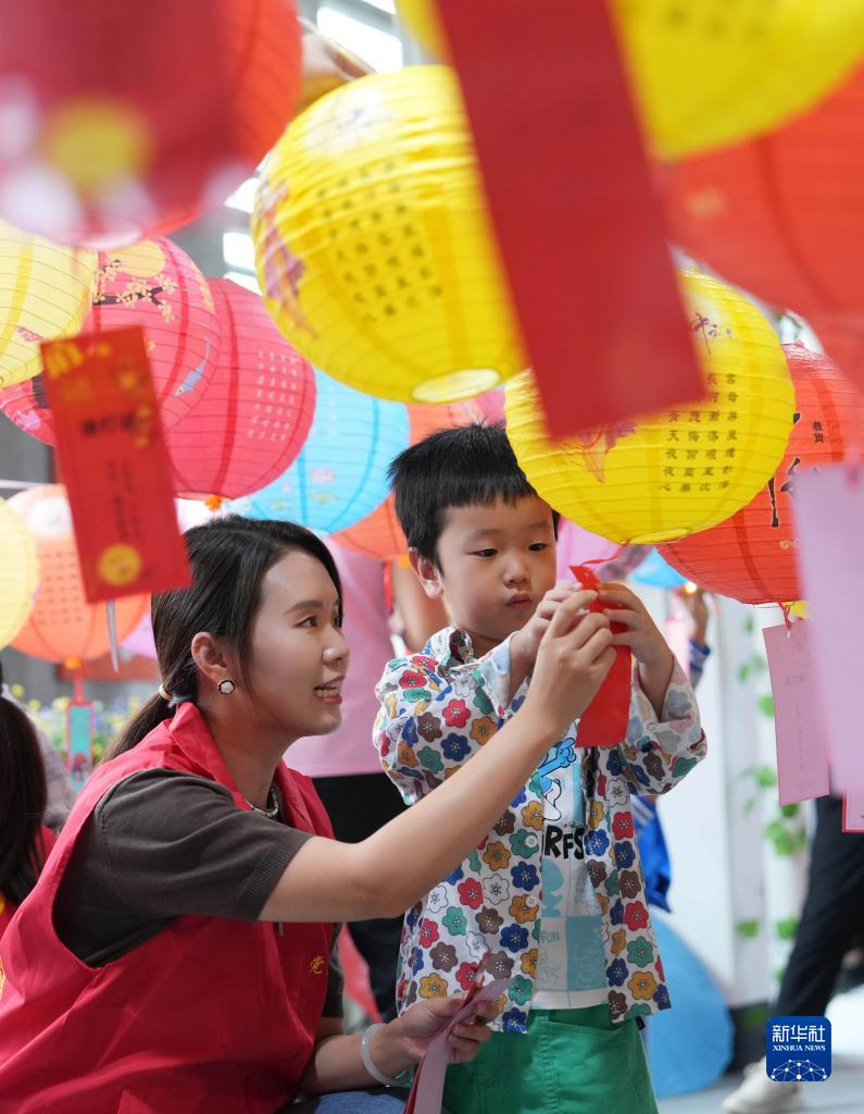 9月26日,在重慶市北碚區(qū)澄江鎮(zhèn)新時代文明實踐站,志愿者和小朋友一起猜燈謎。