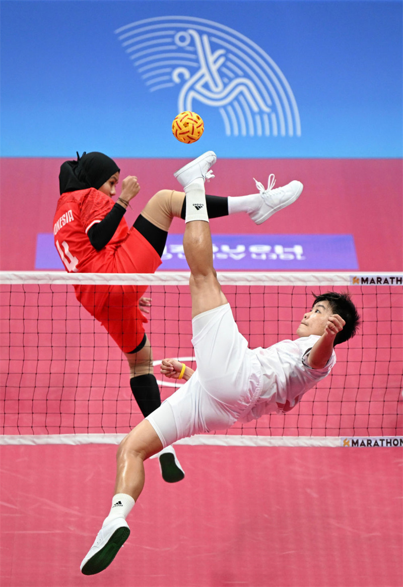 9月24日,泰國隊選手曼利卡·汶托(前)在杭州亞運會藤球女子單組團(tuán)體預(yù)選賽A組比賽中進(jìn)攻。新華社記者 陳鐘昊 攝