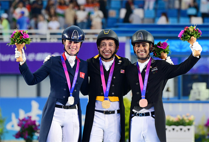 “今天對我來說太重要了,我的妻子、孩子在場邊目睹了這一刻,這是一場永遠值得回憶的比賽。我等這枚金牌已經(jīng)25年了,以前我只獲得過銅牌和銀牌?!卑舶涂瞬粌H實現(xiàn)了個人突破,也贏得了馬來西亞馬術(shù)項目的第一塊亞運金牌。