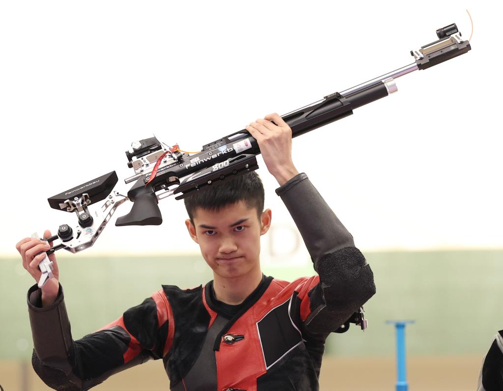 9月25日,杭州亞運會射擊項目男子10米氣步槍個人決賽中,中國選手盛李豪以253.3環(huán)的成績奪冠,并打破該項目世界紀錄。新華社記者 賈浩成 攝