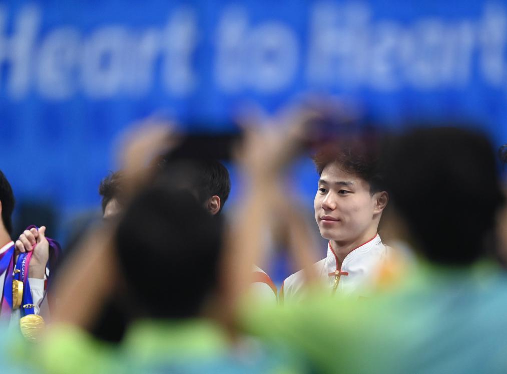 9月29日,中國選手覃海洋與隊友在賽后合影。新華社記者 黃宗治 攝