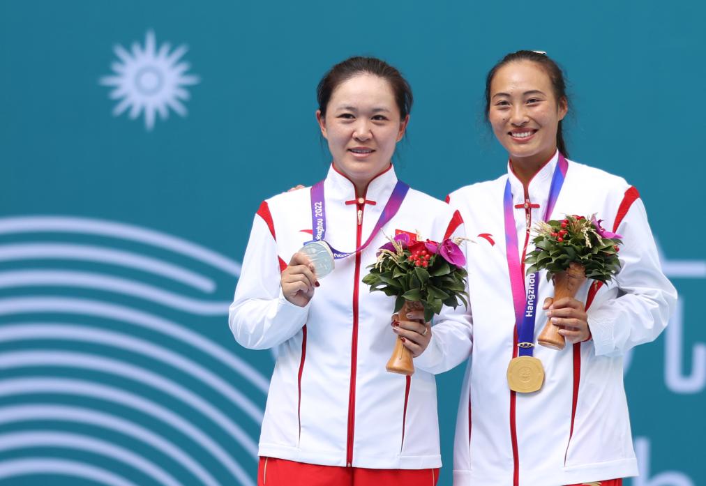 女子網(wǎng)球賽場(chǎng),兩位中國(guó)職業(yè)球員鄭欽文和朱琳攜手為中國(guó)隊(duì)提前鎖定亞運(yùn)網(wǎng)球女單五連冠。決賽過(guò)后,兩人一同舉起國(guó)旗,接受全場(chǎng)歡呼。