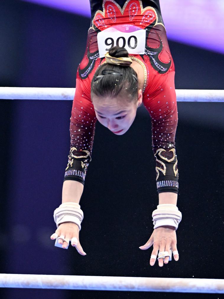 9月25日,中國(guó)隊(duì)選手章瑾在高低杠項(xiàng)目中。新華社記者 程敏 攝