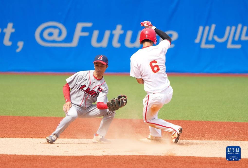 10月1日,中國隊球員梁培(右)在比賽中搶壘。