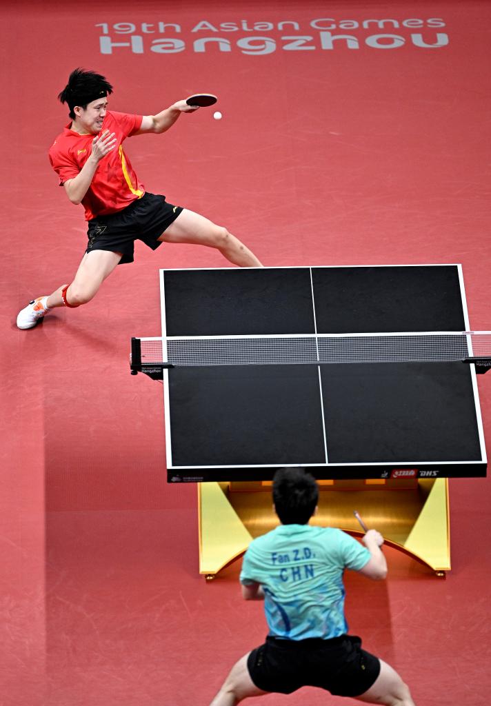 第四局,樊振東以11:7獲勝,雙方大比分戰(zhàn)成2:2。第五局,王楚欽打得更加積極主動,以11:4獲勝。第六局,背水一戰(zhàn)的樊振東在5:5后連續(xù)得分,最終以11:7獲勝,雙方戰(zhàn)至3:3。決勝局,王楚欽在7:7后連得3分,率先獲得賽點(diǎn),并最終以11:8獲勝,首次贏得亞運(yùn)會男單冠軍。