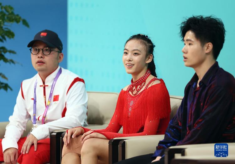 10月4日,中國組合張顥(右)和朱思怡(中)在賽后等候成績。