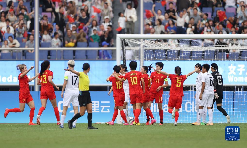 10月6日,中國隊球員在比賽中慶祝進(jìn)球。新華社記者 賈浩成 攝