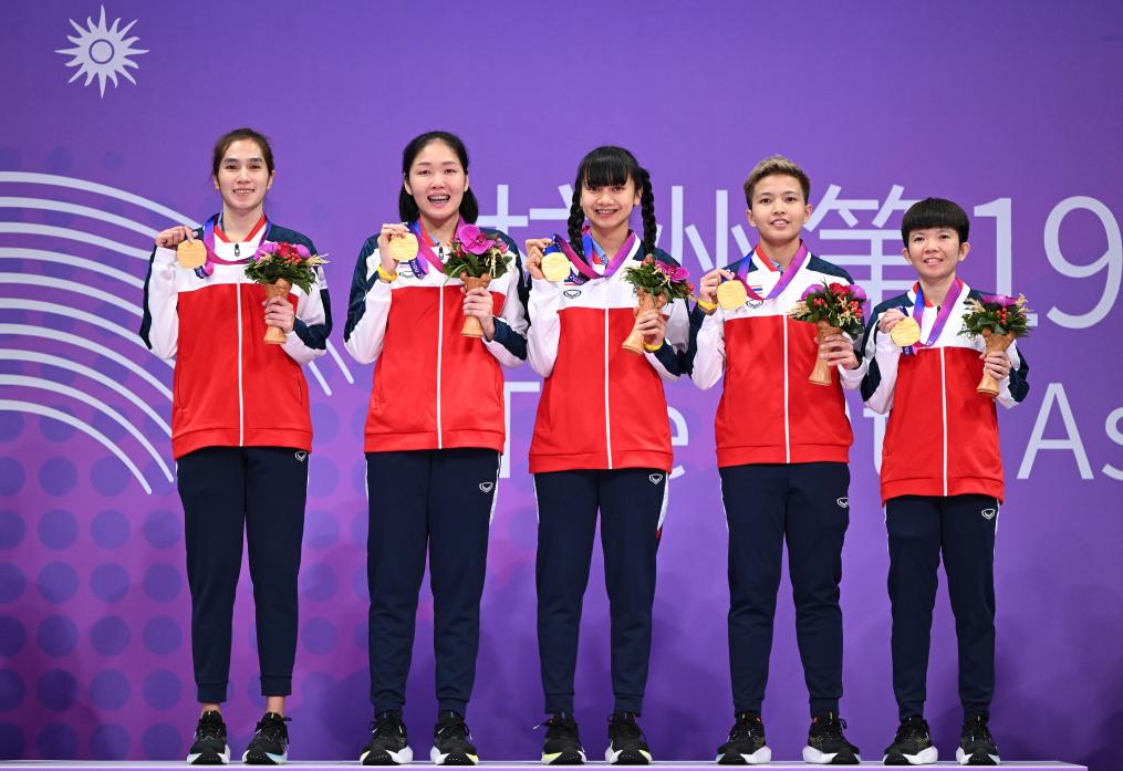 10月7日,杭州亞運(yùn)會(huì)藤球女子單組比賽落幕。冠軍泰國隊(duì)在頒獎(jiǎng)儀式上。新華社記者 陳鐘昊 攝