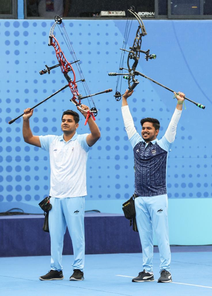 10月7日,在杭州亞運(yùn)會(huì)射箭項(xiàng)目男子復(fù)合弓個(gè)人賽中,印度選手奧賈斯·普拉溫·德奧塔萊(右)獲得冠軍。新華社記者 單宇琦 攝