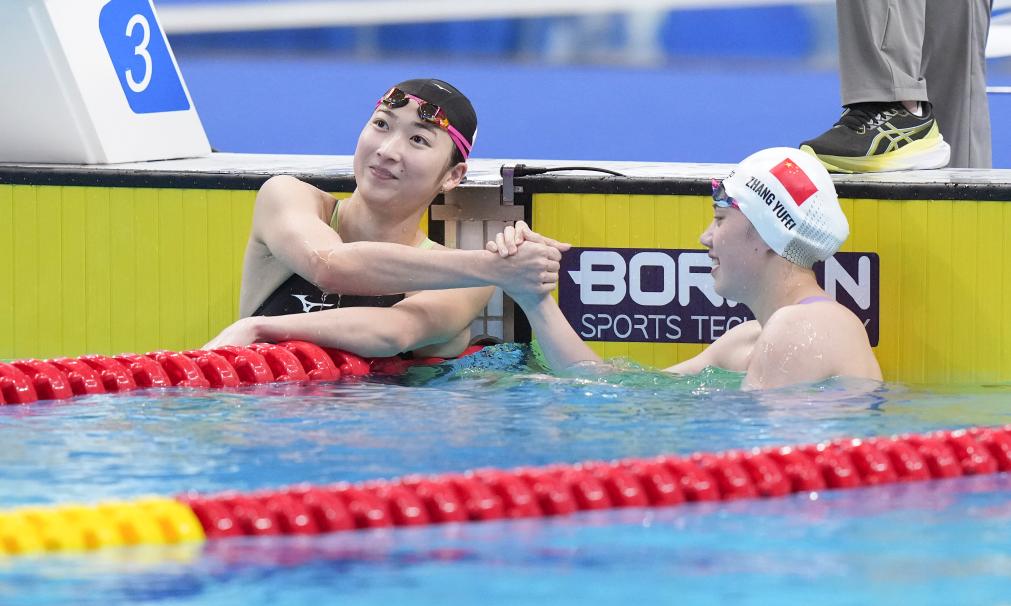 9月29日,中國(guó)選手張雨霏(右)與日本選手池江璃花子在比賽后。新華社記者 杜宇 攝