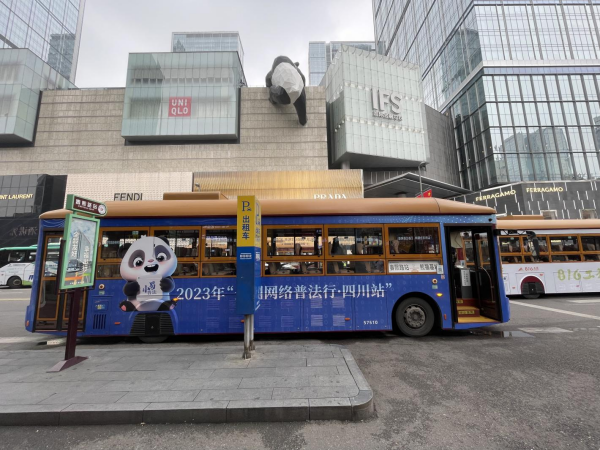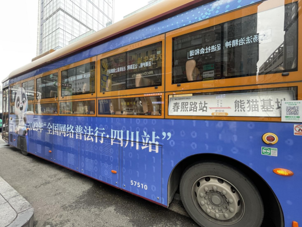 據(jù)介紹,未來一個(gè)月時(shí)間里,成都市民和來蓉游客都能在春熙路商圈的“網(wǎng)紅”地標(biāo)“熊貓爬墻”下,看到網(wǎng)絡(luò)普法主題公交。該主題公交在成都著名的“熊貓觀光線”上運(yùn)行,并往返于成都地標(biāo)春熙路以及熱門景點(diǎn)熊貓基地,途經(jīng)寬窄巷子、文殊院等人氣打卡地,公交車化身普法“宣傳員”,讓網(wǎng)絡(luò)普法宣傳融入城市交通、深入大街小巷、進(jìn)入百姓心中。