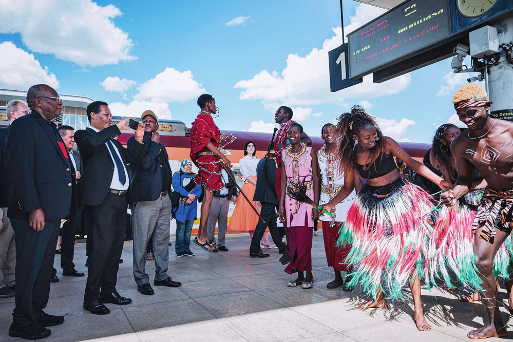 多國(guó)駐肯使節(jié)在肯尼亞內(nèi)羅畢的蒙內(nèi)鐵路內(nèi)羅畢站觀看文藝演出(2023 年 10 月 6 日攝) 王冠森攝 / 本刊