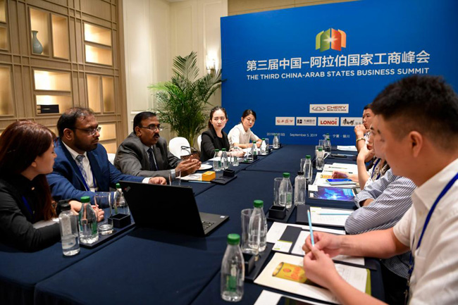2019年9月5日,迪拜工商會(huì)代表與中方代表在第四屆中國(guó)-阿拉伯國(guó)家博覽會(huì)期間進(jìn)行洽談。新華社記者馮開華攝