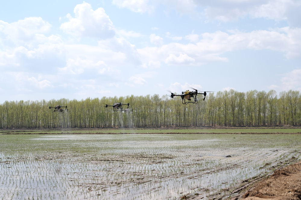 2023年5月,北大荒集團(tuán)軍川農(nóng)場(chǎng)有限公司正使用植保無(wú)人機(jī)對(duì)剛剛插秧的地塊噴施液態(tài)返青肥。新華社記者黃騰 攝