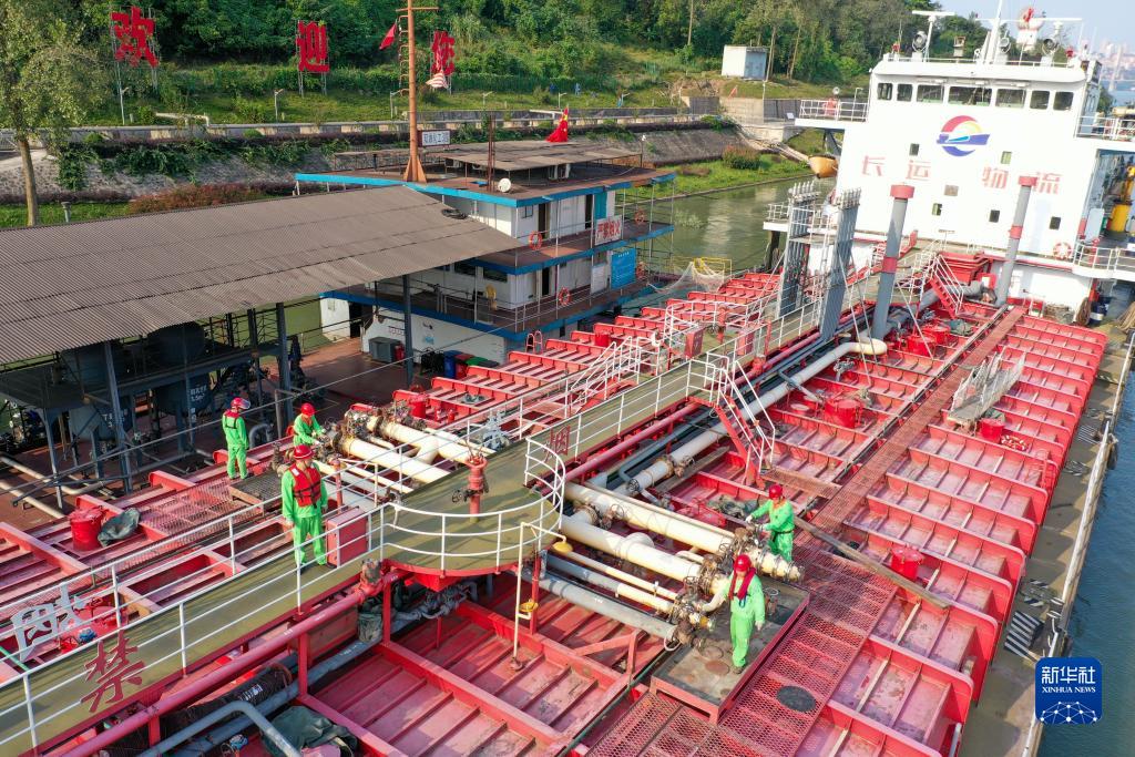 10月17日,在中國石化集團(tuán)重慶川維化工有限公司物流碼頭,工作人員在檢查出口產(chǎn)品裝船情況(無人機(jī)照片)。