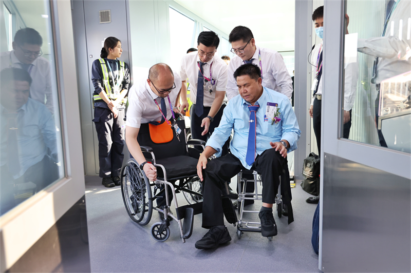 “一共219名代表團(tuán)成員,其中78名輪椅旅客,下客艙后的轉(zhuǎn)換輪椅均已準(zhǔn)備到位?!?4時50分,泰國代表團(tuán)成員搭乘TG8062包機航班落地,工作人員早已提前備好轉(zhuǎn)換輪椅在艙門口等候。