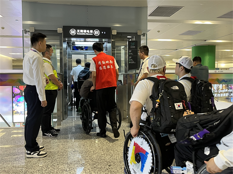 一路上,殘疾運動員沒有遇到一個臺階。廊橋口的無障礙電梯、流線上的無障礙坡道、清晰的標(biāo)識標(biāo)牌、隨處可見的低位飲水機及服務(wù)柜臺,完善的無障礙設(shè)施,都為殘疾運動員創(chuàng)造了便利的出行環(huán)境。抵離工作人員和志愿者全程的暖心陪伴,更是讓抵達(dá)流程“加速”與“升溫”。
