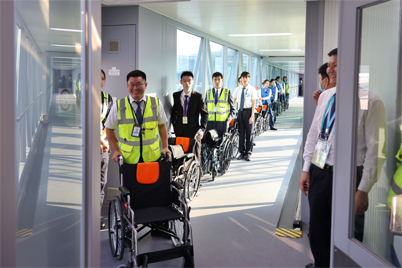 當(dāng)日14時至15時是抵離高峰時段,一小時內(nèi),進(jìn)港賽事人員超400人次,其中輪椅旅客就有140余人。為此,賽事總指揮部抵離指揮中心一周前協(xié)調(diào)相關(guān)部門,租借150把輪椅運送至機場,提前收集代表團(tuán)進(jìn)港航班信息,制定各項應(yīng)急預(yù)案,分析保障難點堵點。杭州蕭山國際機場提前了解輪椅旅客數(shù)量與保障需求,包括電動輪椅、超大超重助殘設(shè)備尺寸等詳細(xì)情況,按照“一航班一方案”的原則,制定差異化保障方案。