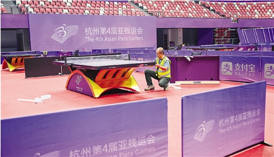 杭州拱墅運河體育公園體育館是杭州亞殘運會乒乓球項目的比賽及訓練場館,目前場館轉換工作已基本就位。記者 董旭明 攝