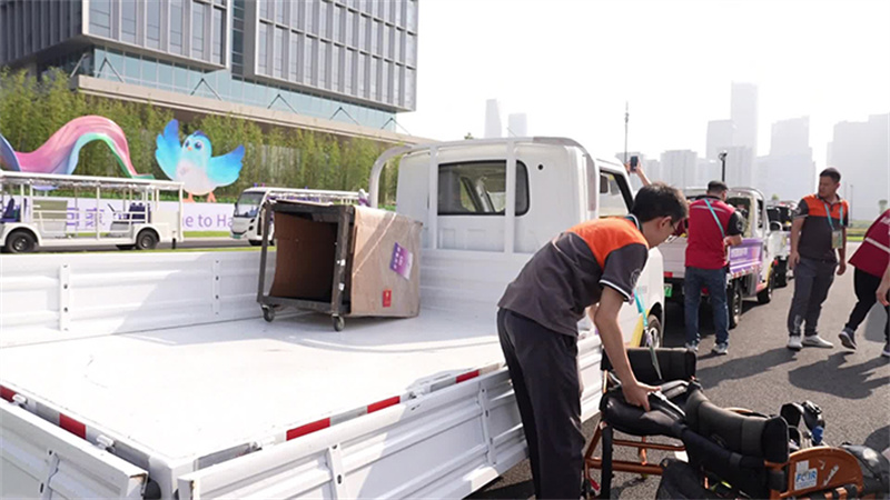 由于殘疾運(yùn)動員的行李相對較多,大件行李的比例也比較高,還包括輪椅等輔助器具,需要小心保護(hù),不能磕碰,亞殘運(yùn)村運(yùn)行團(tuán)隊(duì)從各中心緊急抽調(diào)40余名“精兵強(qiáng)將”為運(yùn)動員提供抵離服務(wù)。大家一方面做好引導(dǎo)工作,陪同運(yùn)動員和隨隊(duì)官員們順利通過安檢,另一方面將隨車行李和行李車上的大件行李搬運(yùn)下來,運(yùn)送至行李安檢口。在運(yùn)動員們進(jìn)行抵達(dá)登記的同時(shí),這些行李已經(jīng)通過了安檢。此時(shí),一條行李運(yùn)送人力“流水線”形成了:工作人員相互接力,將行李快速運(yùn)送至“村”內(nèi)行李車。這樣一來,運(yùn)動員不用奔波勞頓,無需親自動手,體驗(yàn)“無感服務(wù)”,不知不覺間就與自己的行李一同來到了居住區(qū),美妙的“村生活”即刻開啟。