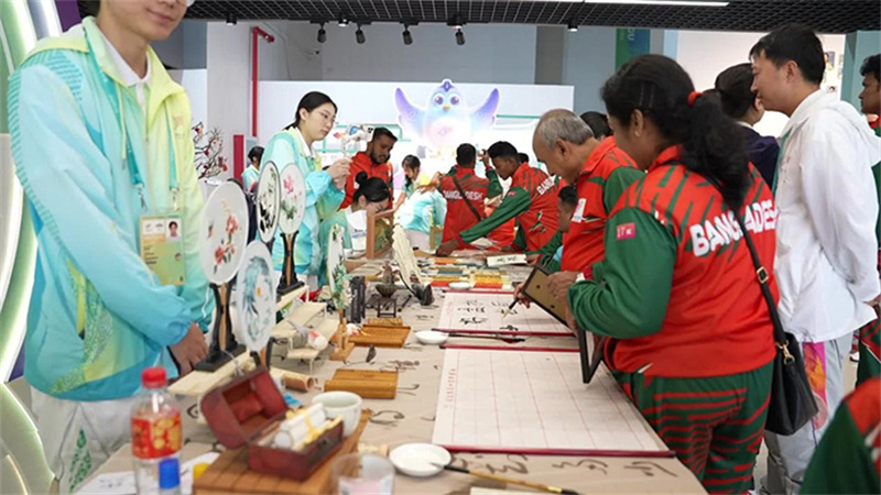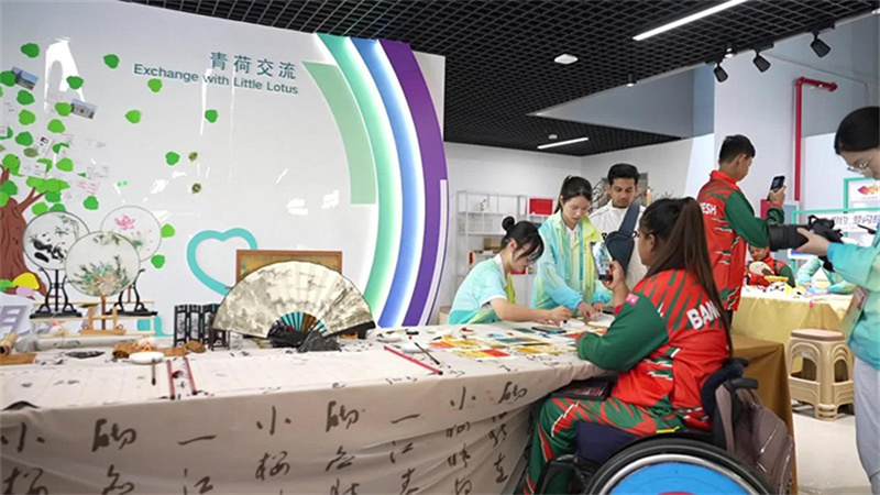 品嘗過美食,想要放松心情,志愿服務(wù)中心是個(gè)好去處。孟加拉國代表團(tuán)的運(yùn)動員們,正在“小青荷”的引導(dǎo)下參觀志愿服務(wù)文化展、體驗(yàn)各類互動活動。
