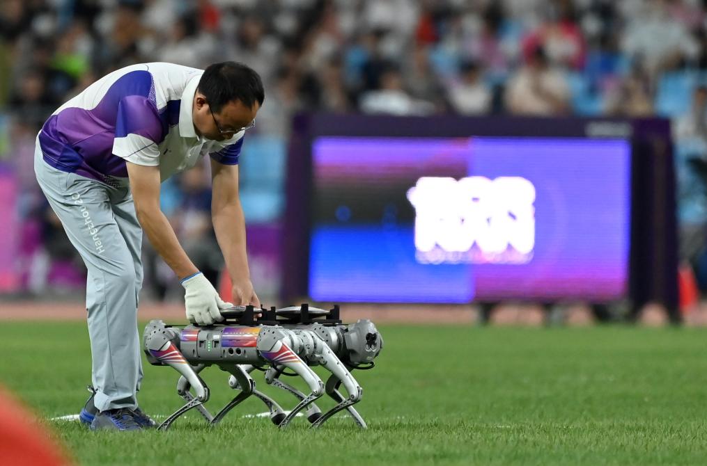 10月1日,在杭州亞運會田徑女子鐵餅決賽前,一名工作人員將鐵餅放在用來搬運鐵餅的機器狗上。新華社記者江漢攝