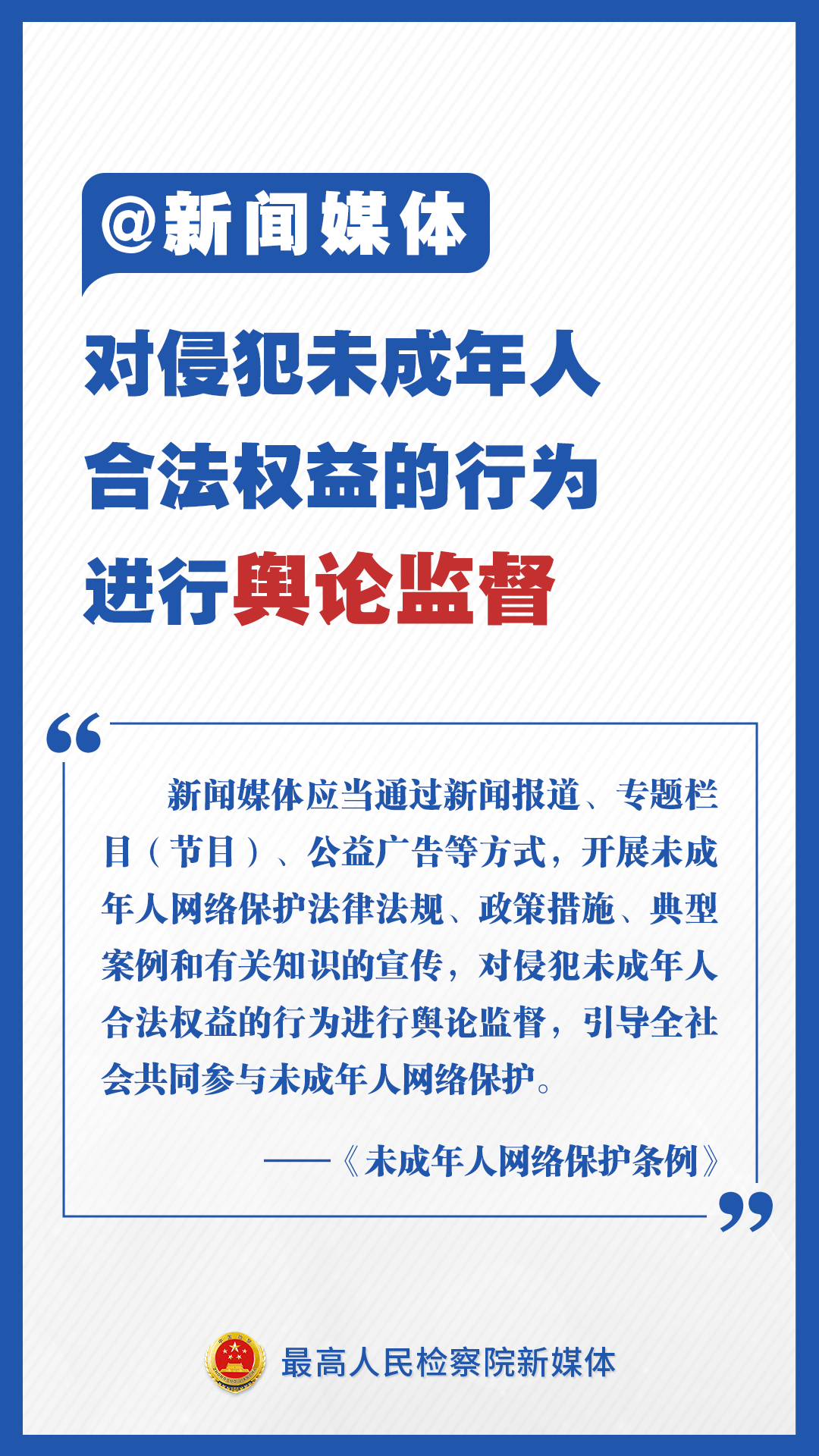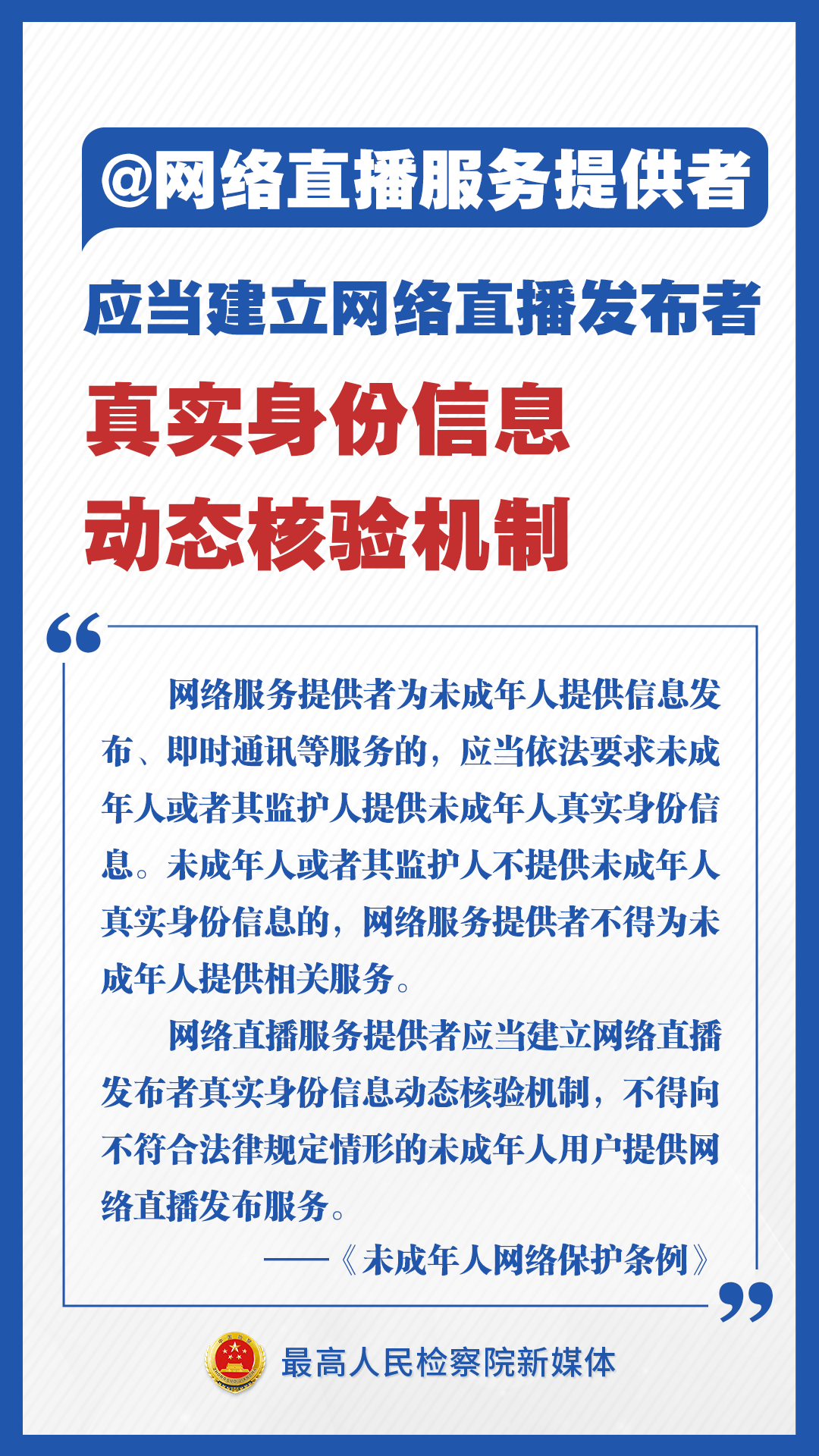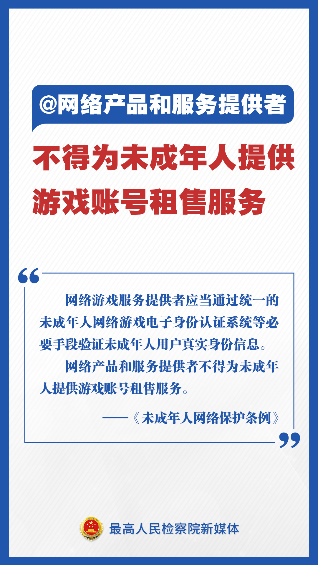 《未成年人網(wǎng)絡(luò)保護(hù)條例》來了!檢察君為你劃重點(diǎn),速讀未成年人網(wǎng)絡(luò)保護(hù)新舉措!不得通過網(wǎng)絡(luò)對(duì)未成年人實(shí)施侮辱、誹謗等網(wǎng)絡(luò)欺凌行為;不得為未成年人提供游戲賬號(hào)租售服務(wù);建立網(wǎng)絡(luò)直播發(fā)布者真實(shí)身份信息動(dòng)態(tài)核驗(yàn)機(jī)制……速速轉(zhuǎn)發(fā)擴(kuò)散!