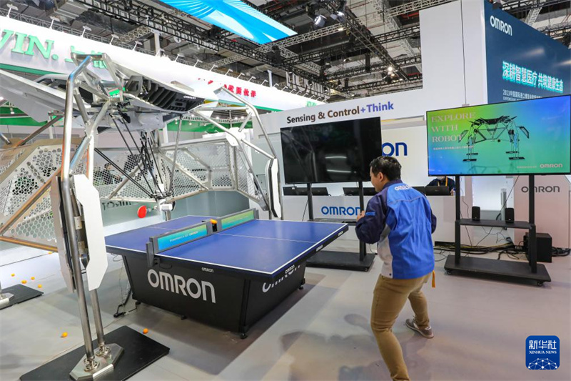 11月2日,工作人員在歐姆龍展位測(cè)試乒乓球教練機(jī)器人。