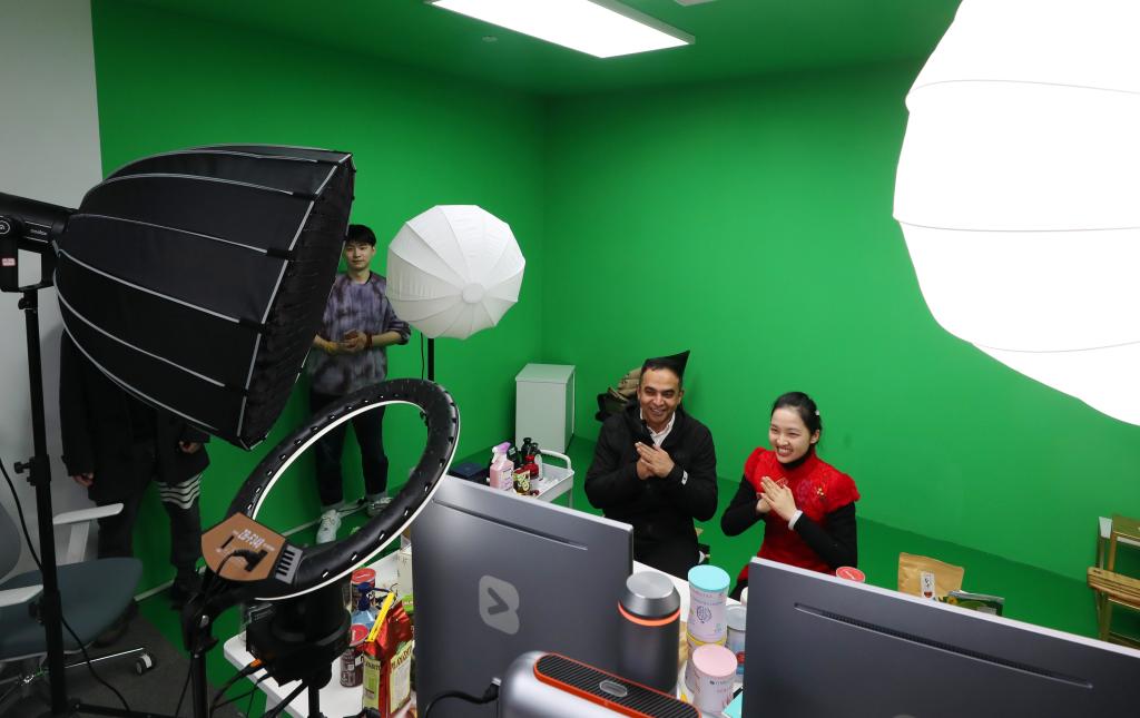來(lái)自巴基斯坦的商人李龍(右二)在虹橋品匯的直播間內(nèi)直播。新華社記者方喆 攝