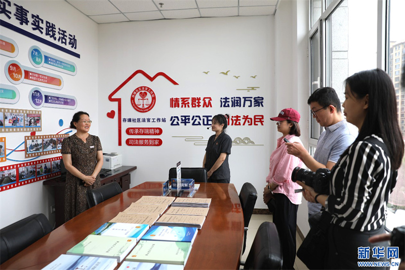 隆化縣人民法院存瑞社區(qū)法官工作站調(diào)解員林瑩(左一)向新時代“楓橋經(jīng)驗”網(wǎng)絡(luò)主題宣傳活動河北行采訪團成員介紹調(diào)解情況。新華網(wǎng) 高麗攝