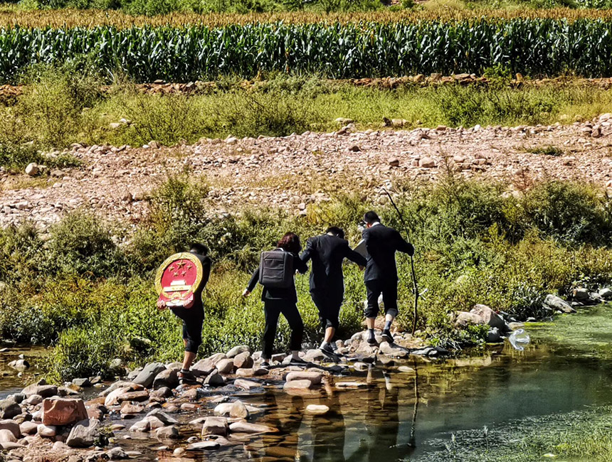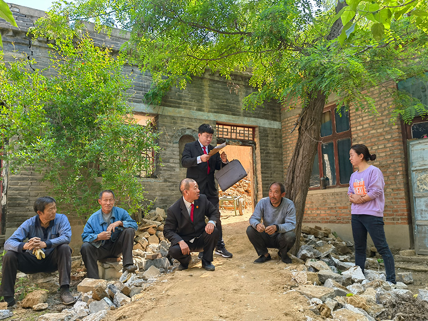 王世廣(左一)與同事入村進行案件回訪。魏振敏攝