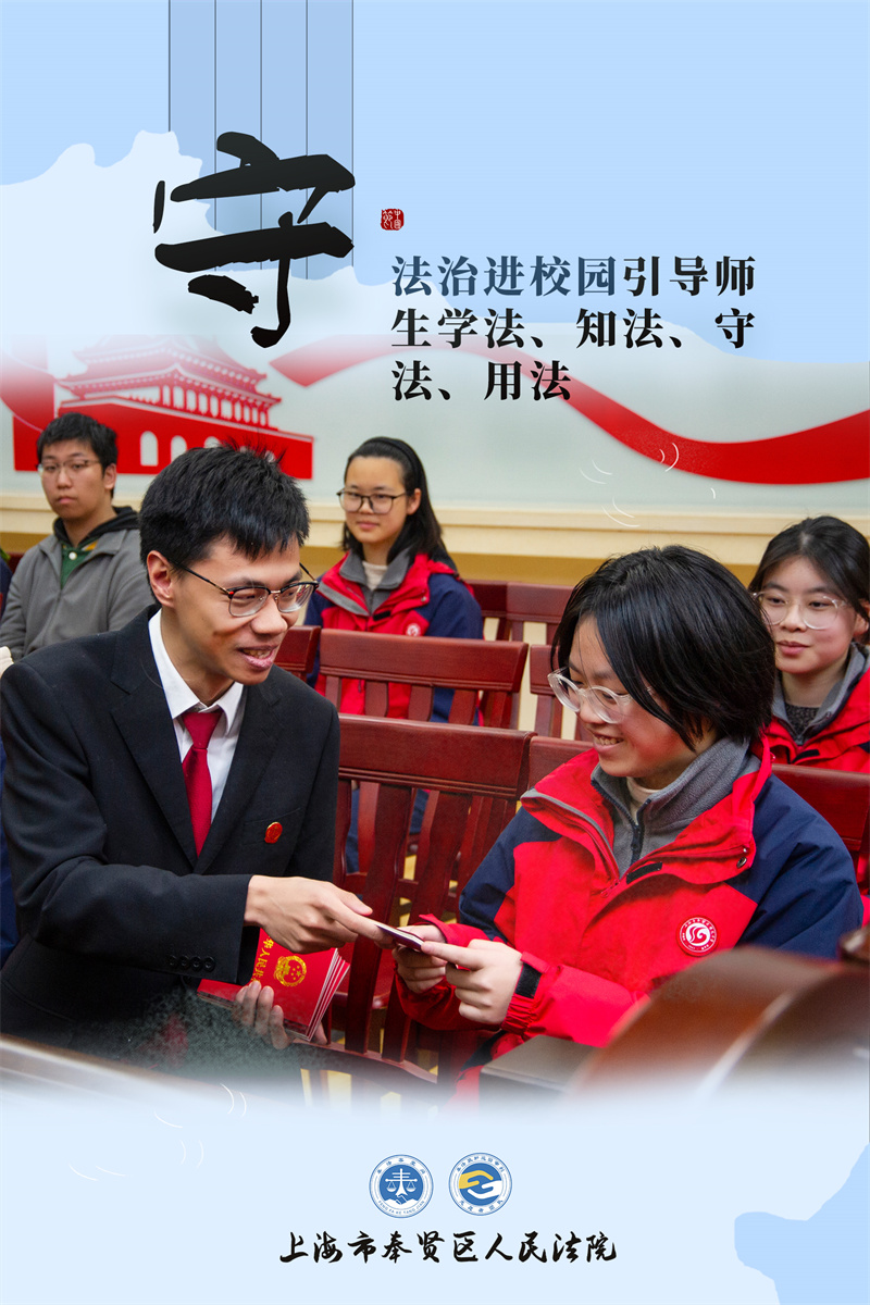 在上海市奉賢法院奉城法庭的法治進(jìn)校園教學(xué)點(diǎn)——奉城鎮(zhèn)曙光中學(xué)內(nèi),法官助理正在向高二的同學(xué)們分發(fā)憲法宣傳冊(cè),并通過(guò)釋法析理引導(dǎo)同學(xué)們學(xué)法、知法、守法、用法,在心中播下法治的種子。