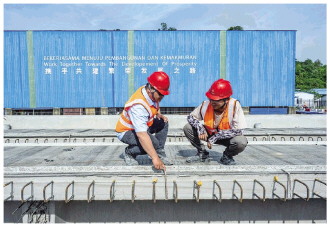 中馬共建“一帶一路”的標(biāo)志性項(xiàng)目——馬來西亞東海岸鐵路(馬東鐵)建設(shè)如火如荼。圖為2023年4月26日,在馬來西亞吉蘭丹州的馬東鐵項(xiàng)目一分部制梁場(chǎng),技術(shù)主管鄧友志(右)和馬來西亞本地青年員工鄧德緯討論生產(chǎn)情況。 新華社記者 朱煒 攝