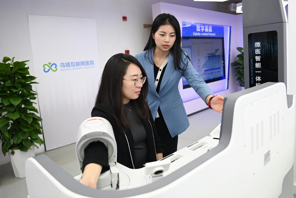 11月7日,參觀者在烏鎮(zhèn)互聯(lián)網(wǎng)醫(yī)院體驗智能一體機(jī)的體檢功能,并與醫(yī)生進(jìn)行視頻連線。 新華社記者黃宗治 攝